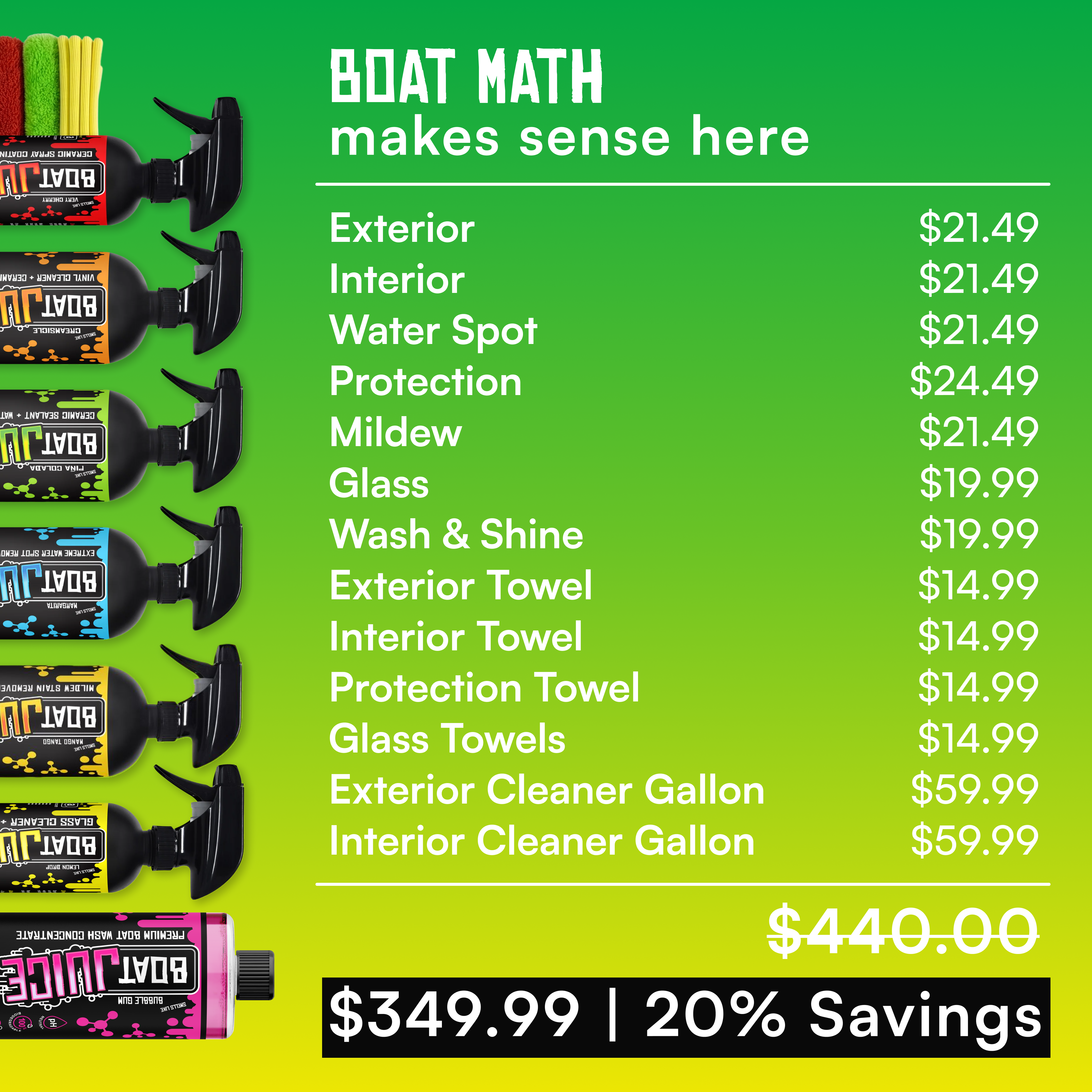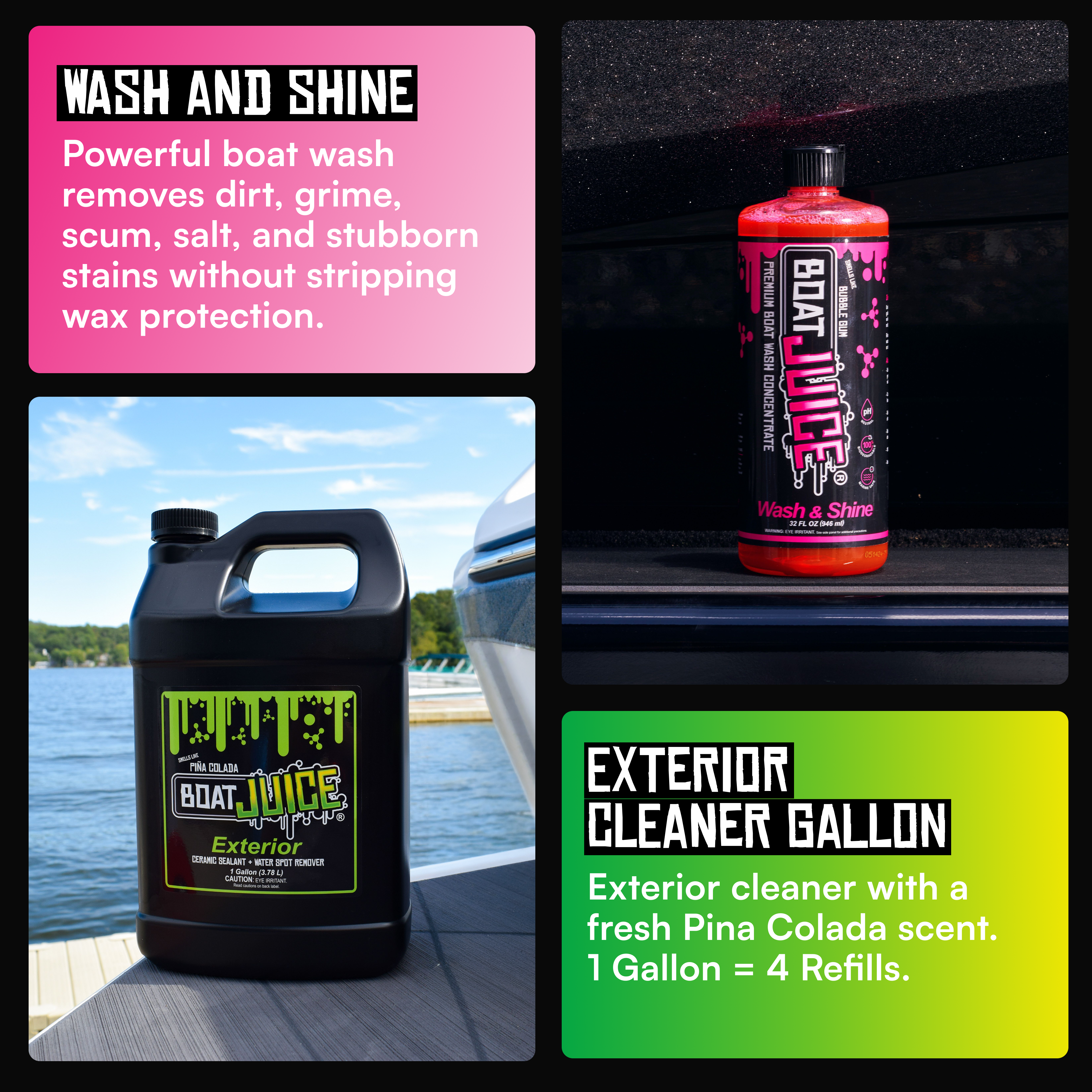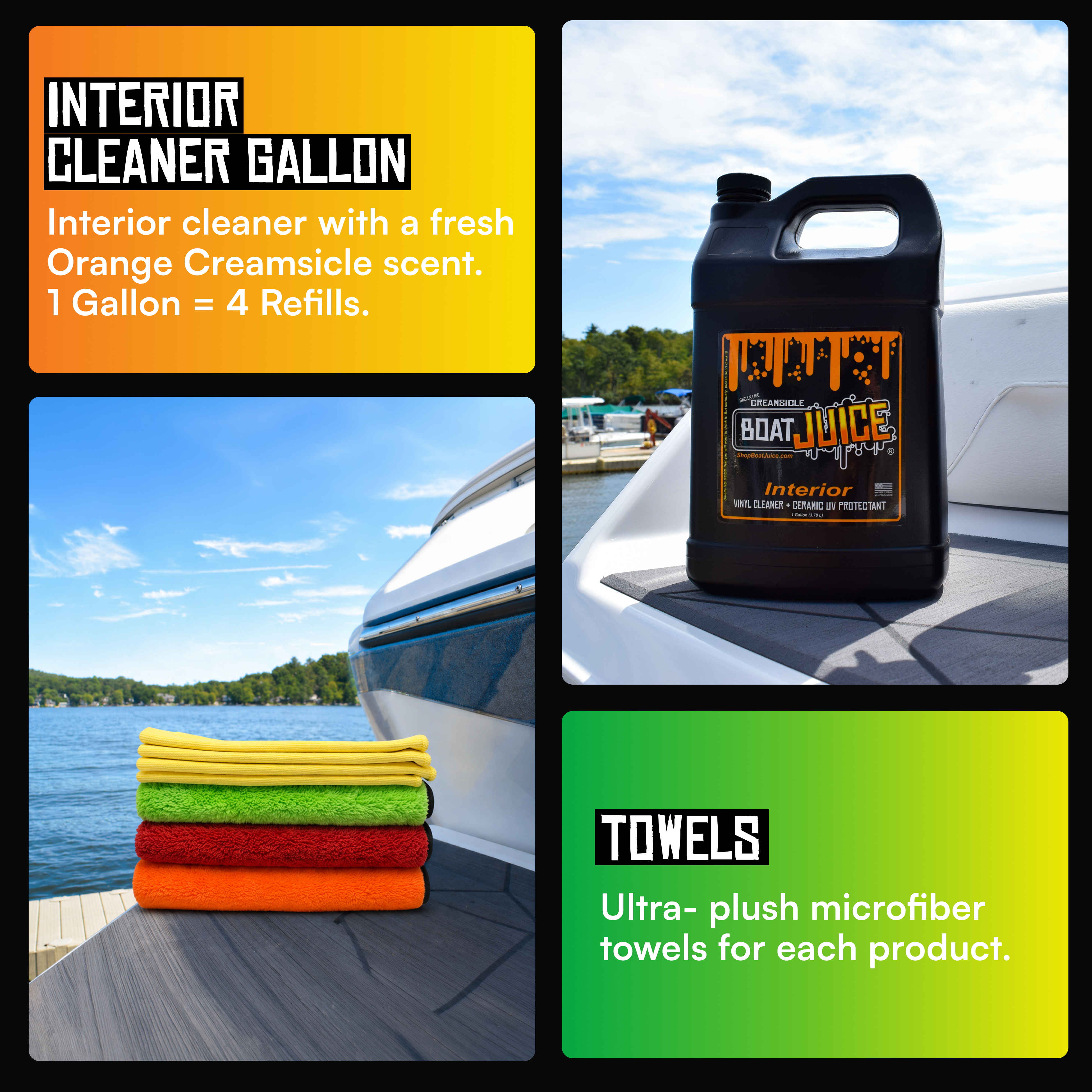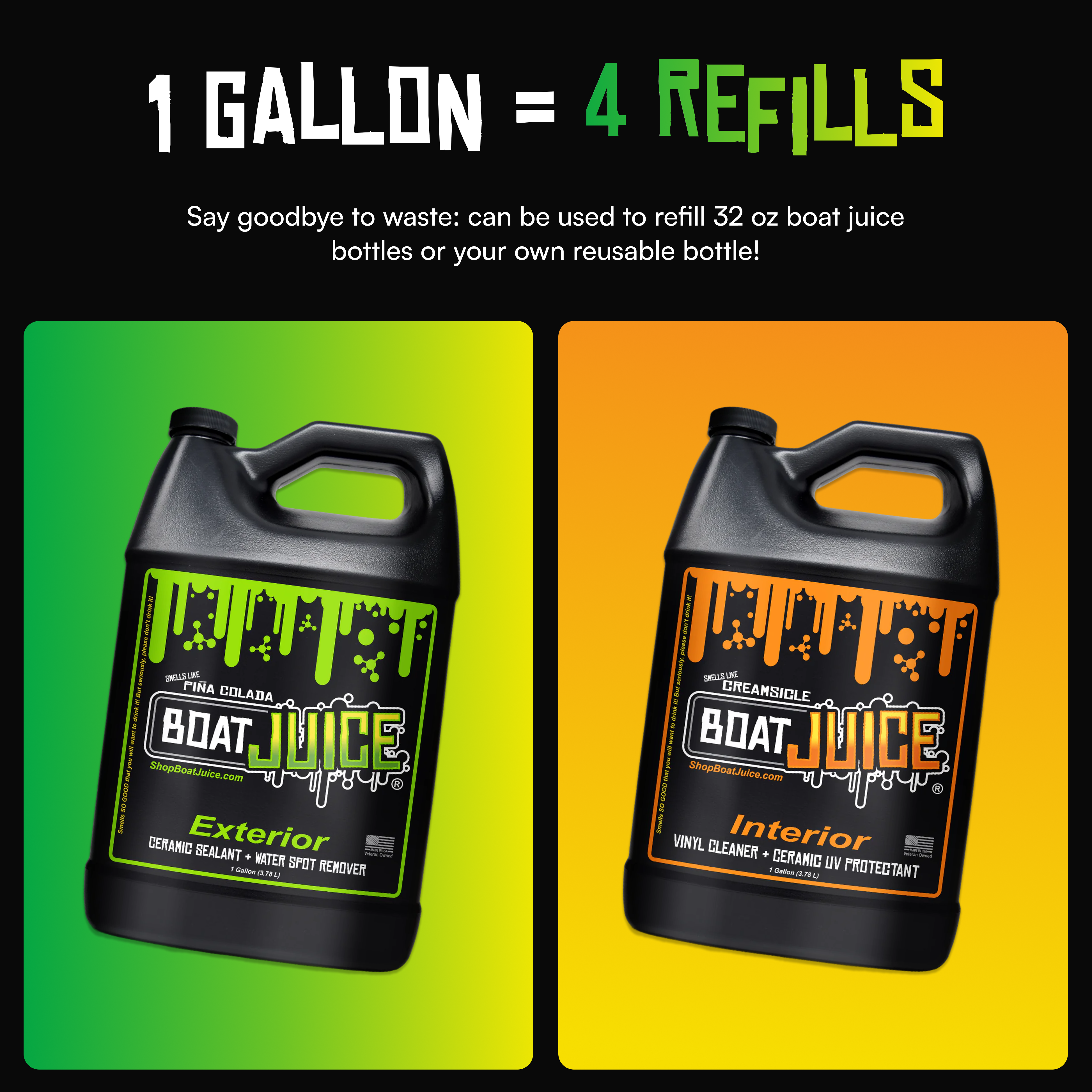 Ready to go full-send on clean? The Boat Juice Complete Kit gives you the entire lineup of our best-selling interior and exterior essentials—plus gallon-size refills to keep the juice flowing. From vinyl to glass and gel coat, this kit crushes water spots and dirt, protects with ceramic technology, and leaves your boat smelling like a tropical dream. It's everything you need to keep your boat looking as good as new.