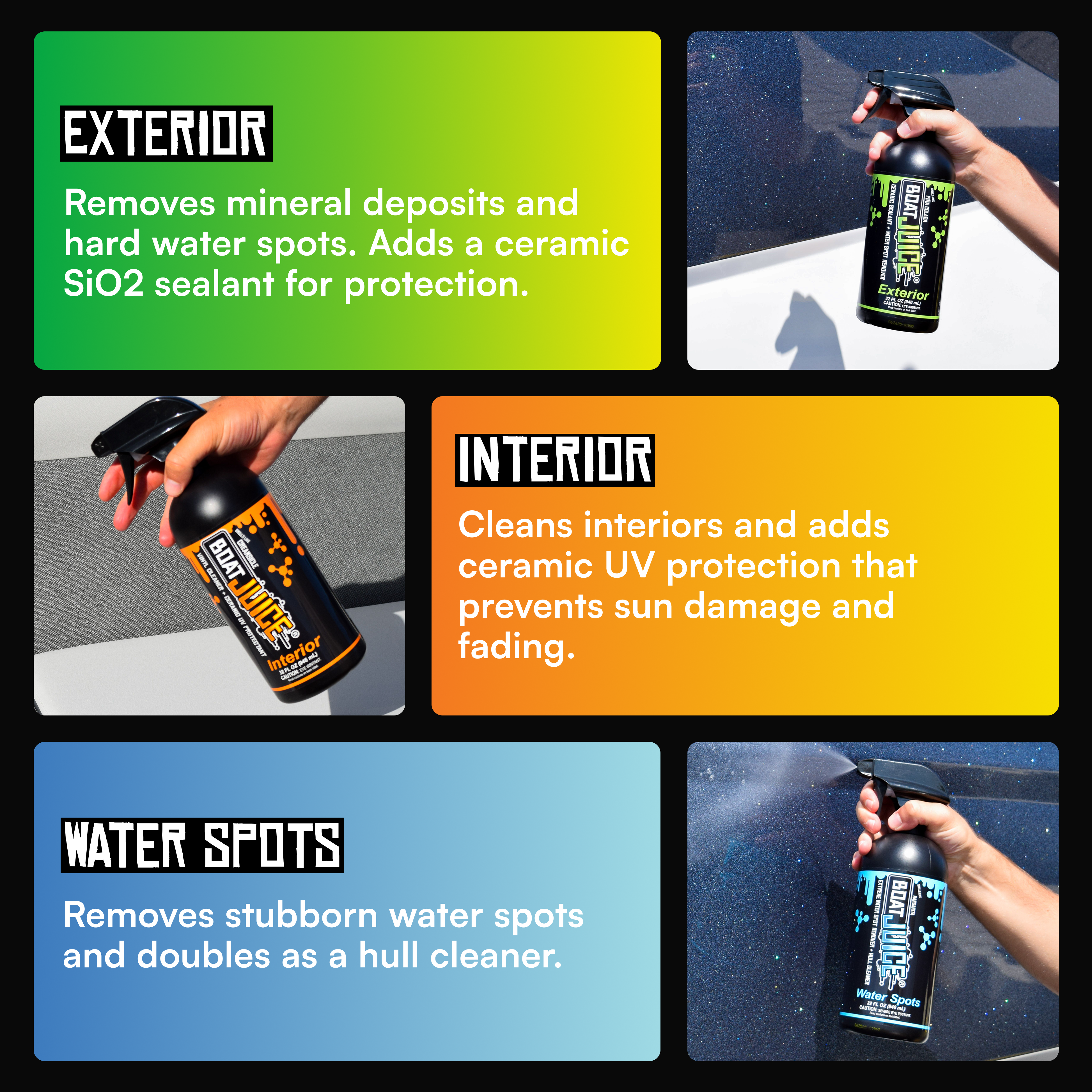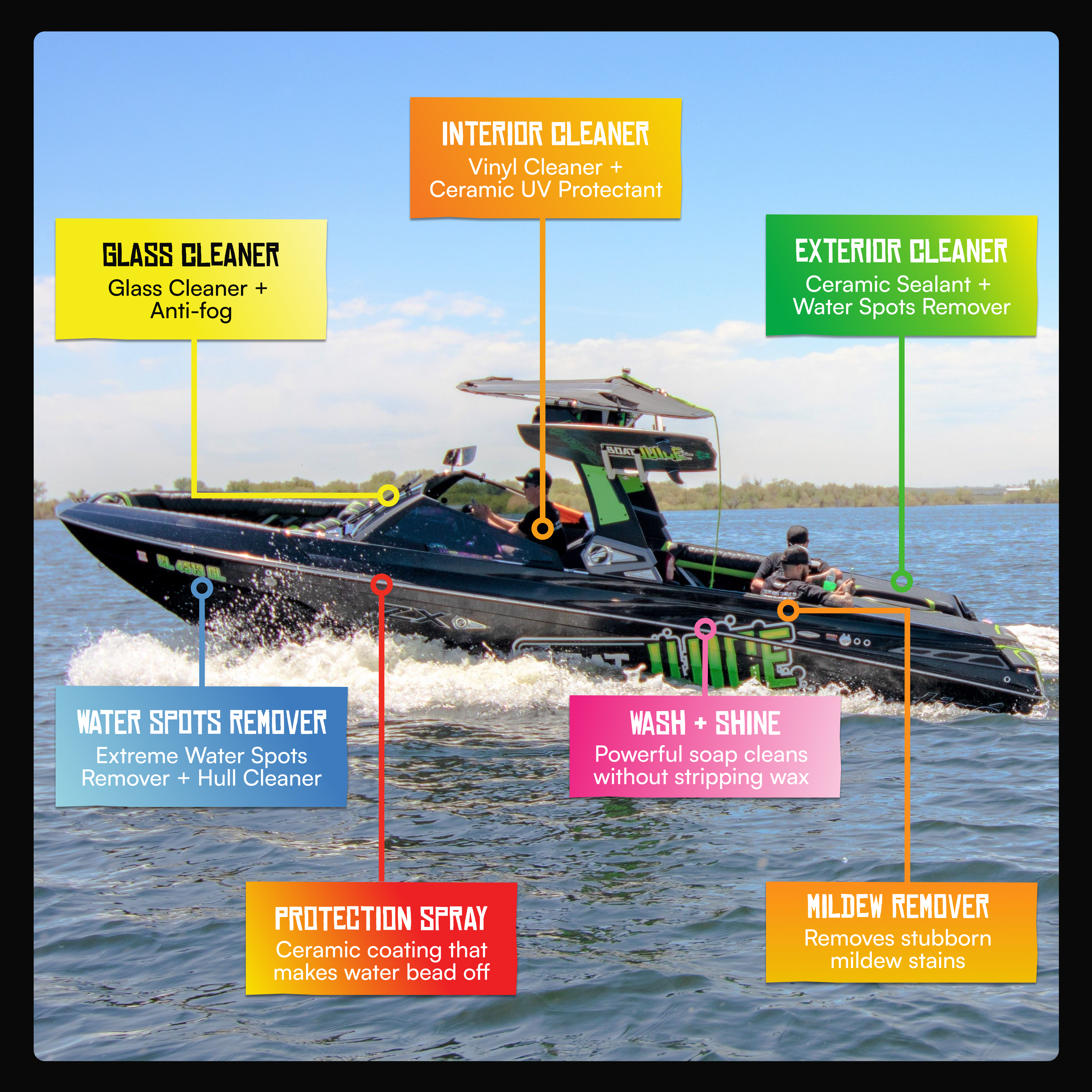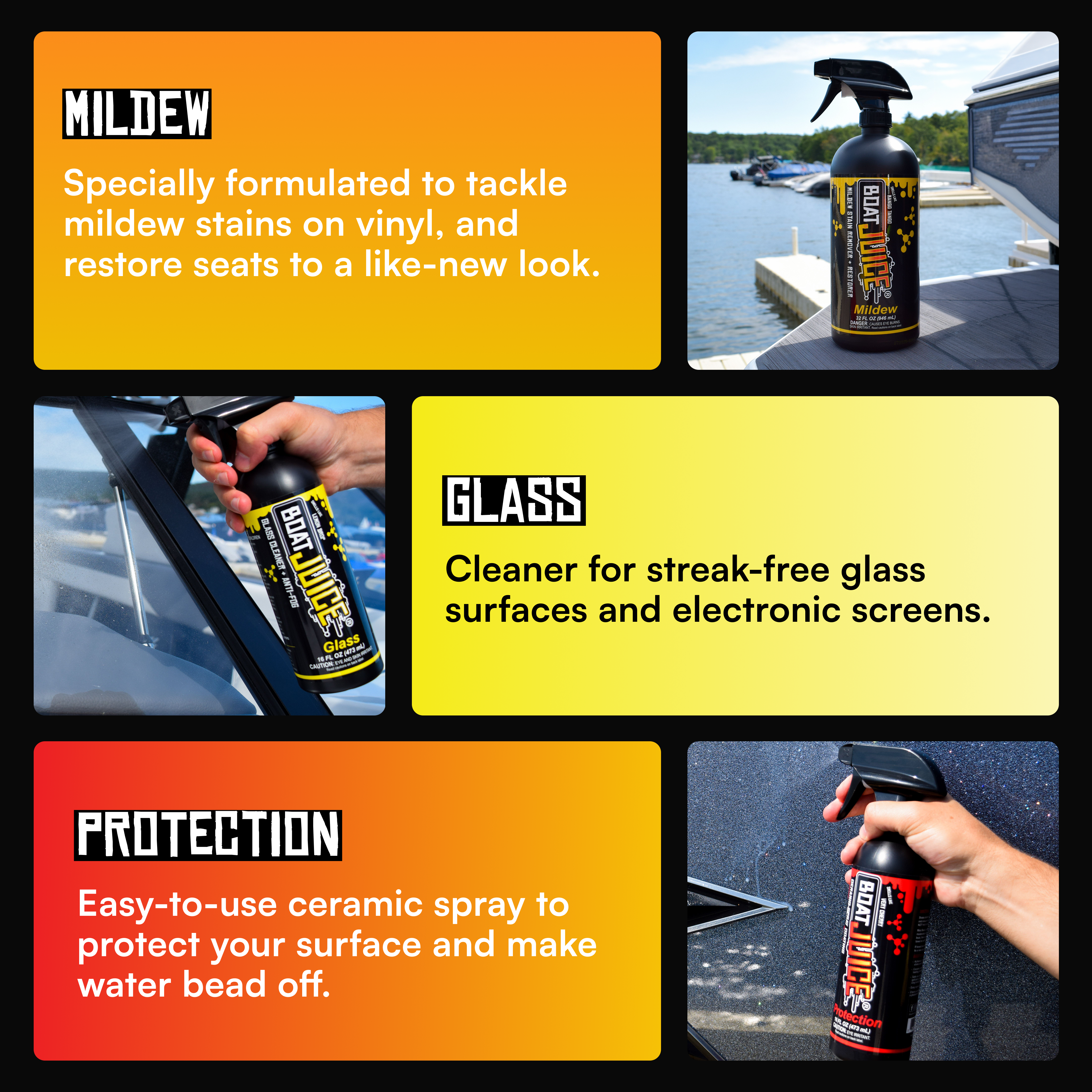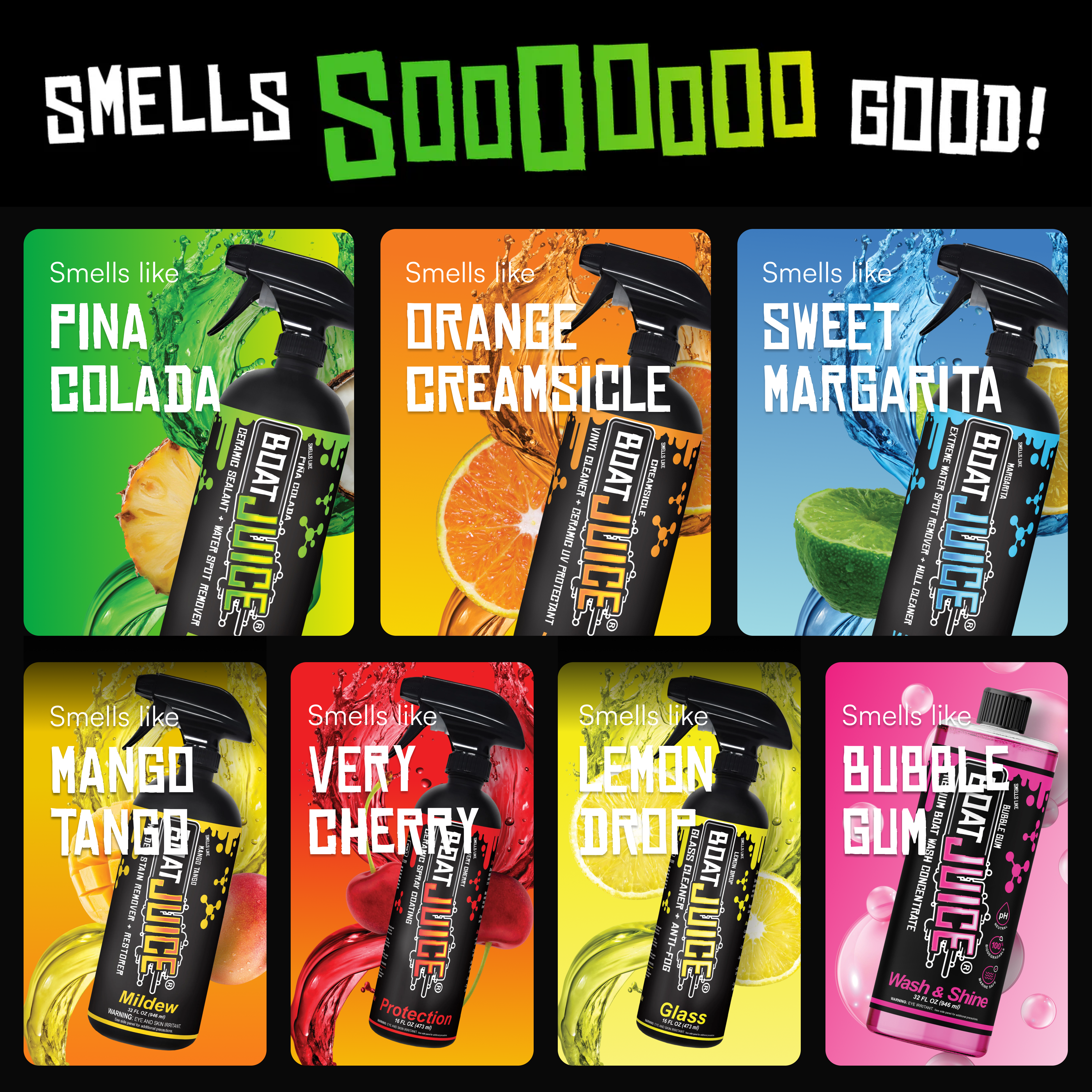 Ready to go full-send on clean? The Boat Juice Complete Kit gives you the entire lineup of our best-selling interior and exterior essentials—plus gallon-size refills to keep the juice flowing. From vinyl to glass and gel coat, this kit crushes water spots and dirt, protects with ceramic technology, and leaves your boat smelling like a tropical dream. It's everything you need to keep your boat looking as good as new.