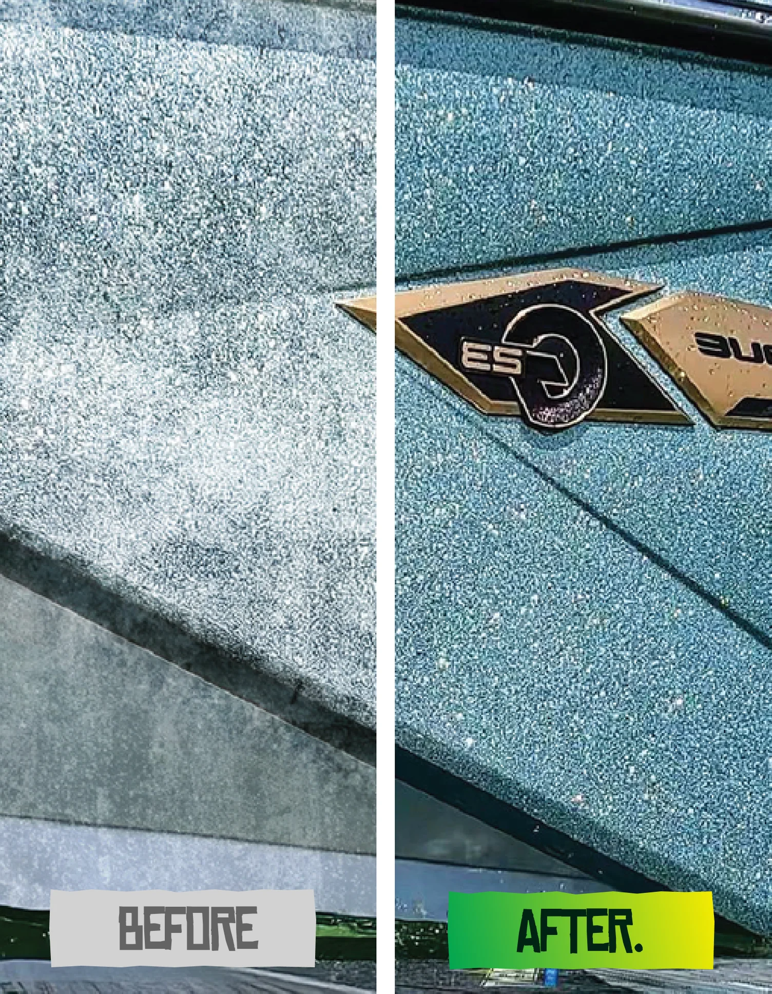 Same boat. Same surfaces. Left is what accumulates when maintenance gets skipped. Right is the result one cleaning session.